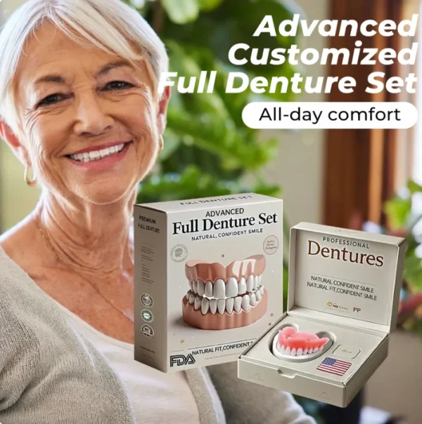 Instant Perfect Smile: Transform your smile instantly with the . Experience the satisfaction of achieving a flawless. customized fit right away. Our innovative denture set eliminates the discomfort of poorly fitting dentures. offering you a snug and natural feel that makes your dentures feel like a true part of your mouth. Say goodbye to sore spots and irritation as Denture Set provides immediate relief. allowing you to enjoy your smile with newfound confidence and comfort. Enjoy a seamless transition to a better-fitting. more comfortable denture experience without delay.