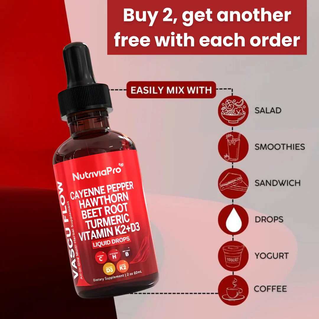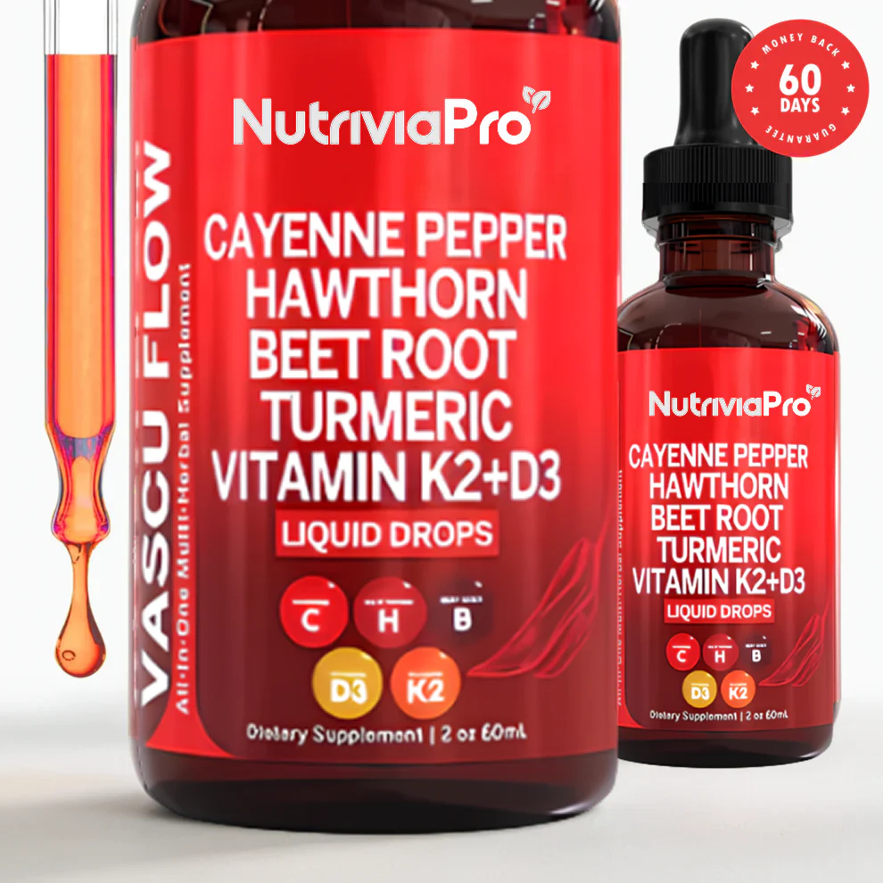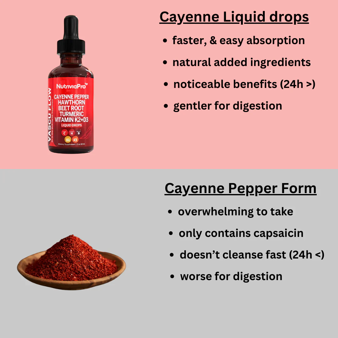 Our Cayenne Pepper Liquid Drops use a potent blend of cayenne pepper, hawthorn extract, and beetroot to improve circulation, cleanse arteries, and reduce plaque buildup. Packed with turmeric, vitamins K2 + D3, and antioxidants, it detoxifies and nourishes your body naturally.